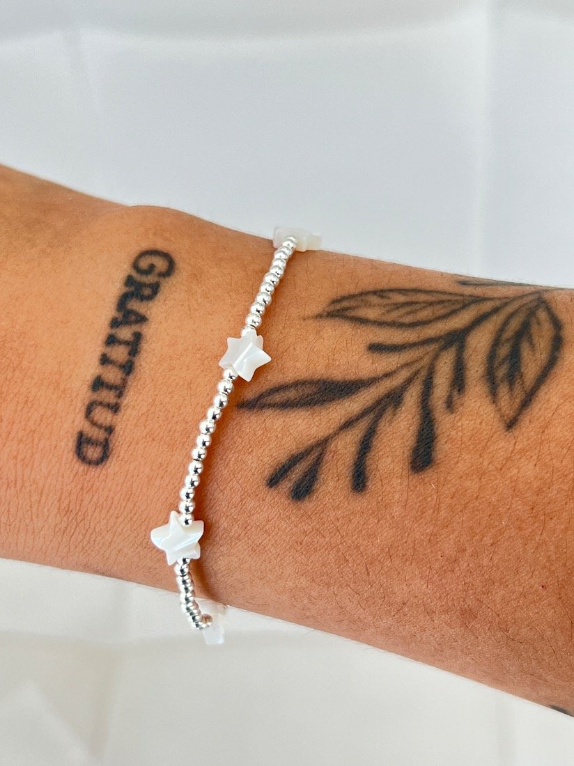 PULSERA ELASTIZADA BOLITAS Y ESTRELLAS DE NACARPLATA 925