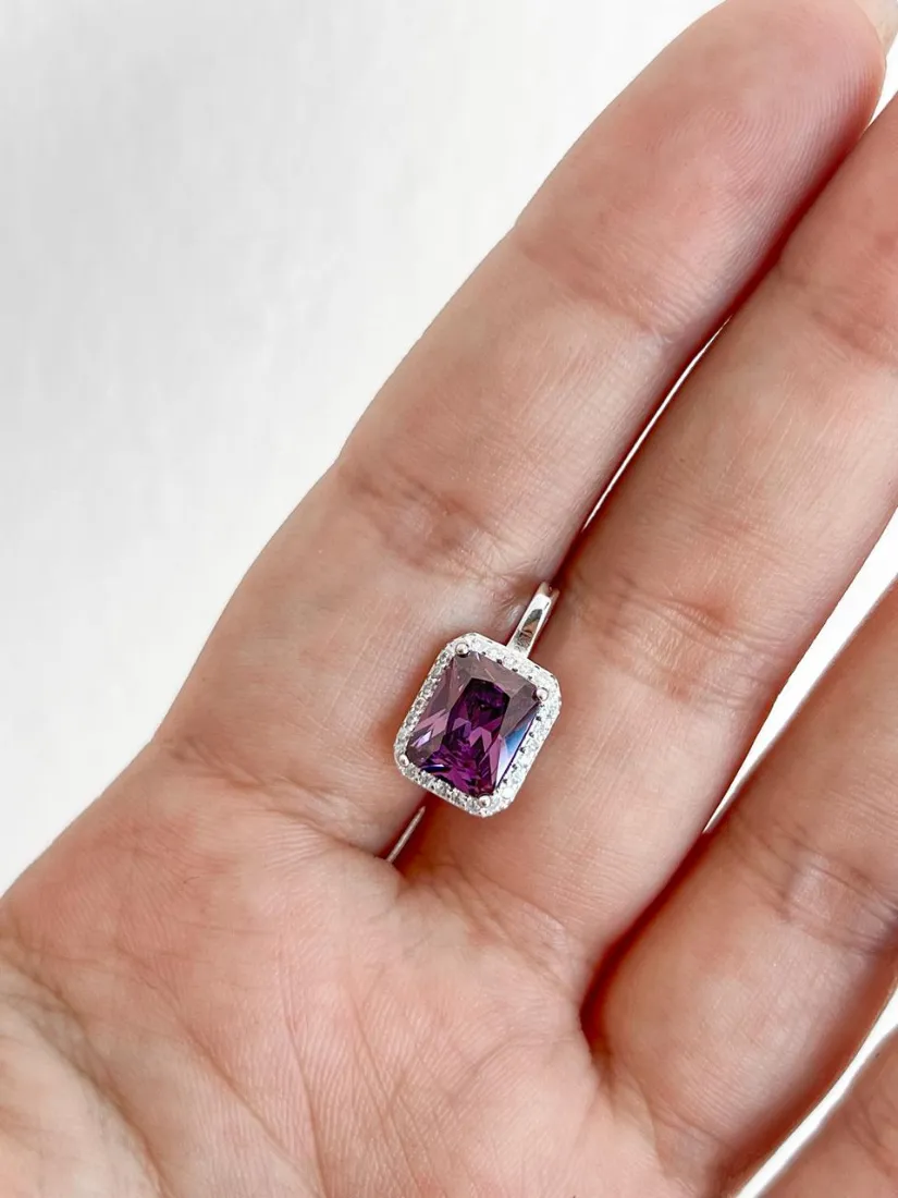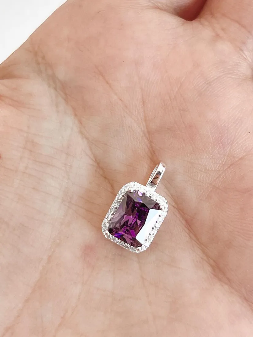 DIJE RECTANGULAR C/ZIRCON LILA AMATISTA PLATA 925 MED 9X11 MM
