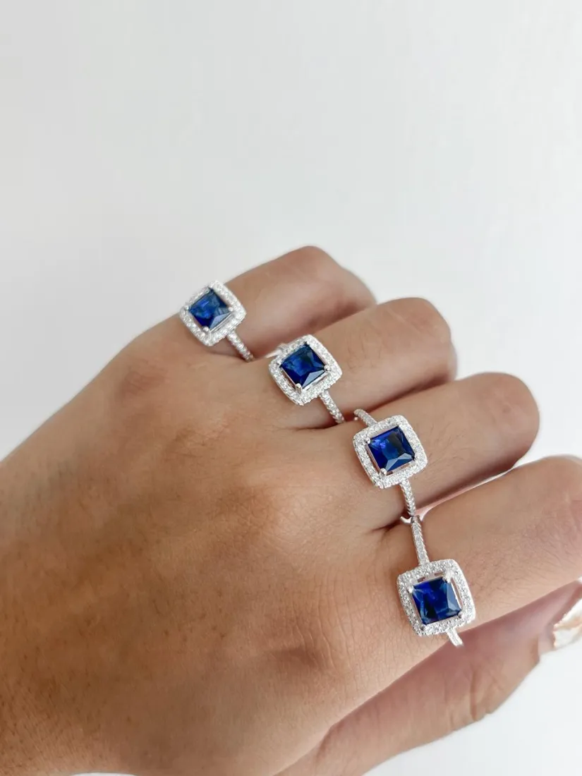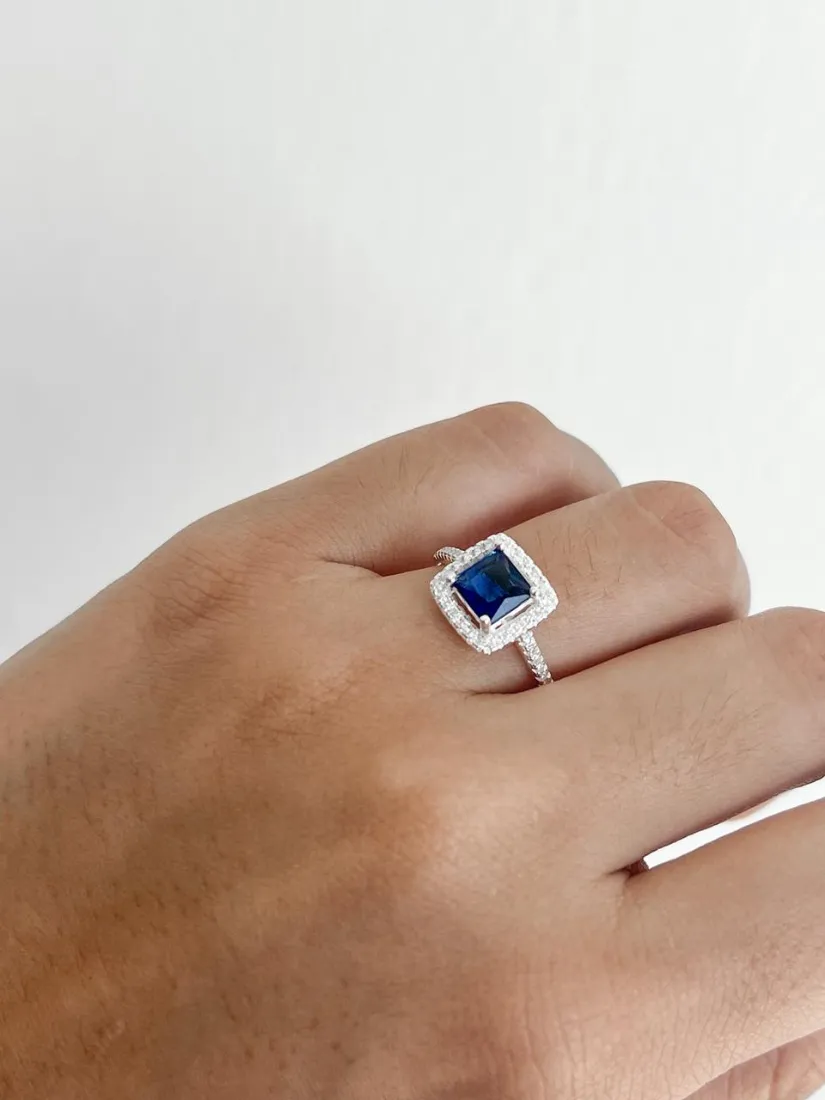 ANILLO CUADRADO C/ZIRCON AZUL SAFIRO Y MICROPAVE PLATA 925