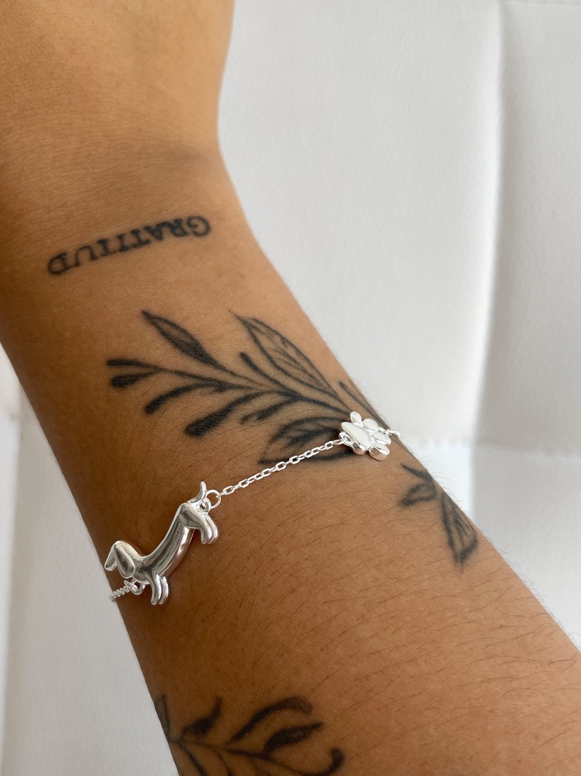 PULSERA FOCETINA C/DIJE PERRO SALCHICHA Y HUELLITA PLATA 925 ITALY MED 17+3
